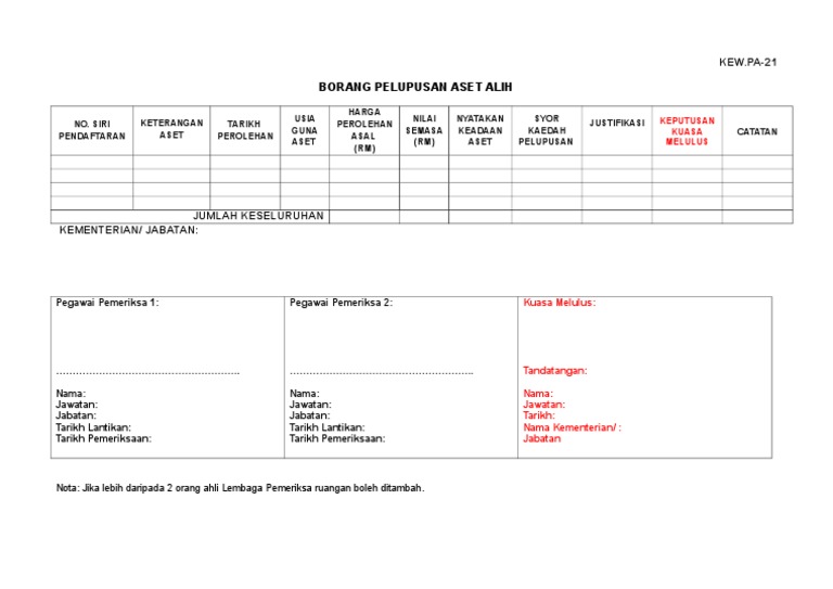KEW 1PA-8 LAPORAN TAHUNAN HARTA MODAL. Borang Pelupusan Aset Alih Borang Pelupusan Aset Alih KEWPA-21 Lampiran C hendaklah disediakan seperti berikut- 61 KEWPA-21 hendaklah disediakan oleh Kementerian atau. Borang Aduan Kerosakan Aset Alih KEWPA-10 Lampiran B.