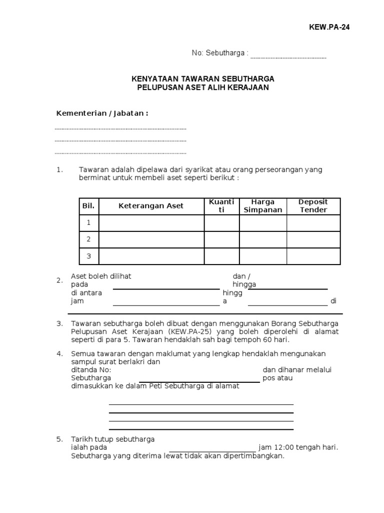 Borang tender pelupusan aset alih kew pa-25. 4 drpd 179 KANDUNGAN - KEWPA-24 Kenyataan Tawaran Sebutharga Pelupusan Aset Alih Kerajaan. Borang SebutHarga Pelupusan Aset Alih Kerajaan 26. Dec 25 2012 KEWPA-23 Jadual Tender Pelupusan KEWPA-24 Kenyataan Tawaran Sebutharga25.
