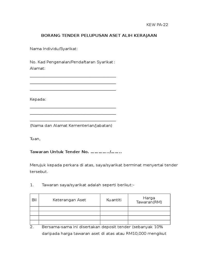 22 Kew Pa 22 Borang Tender Pelupusan Aset Alih
