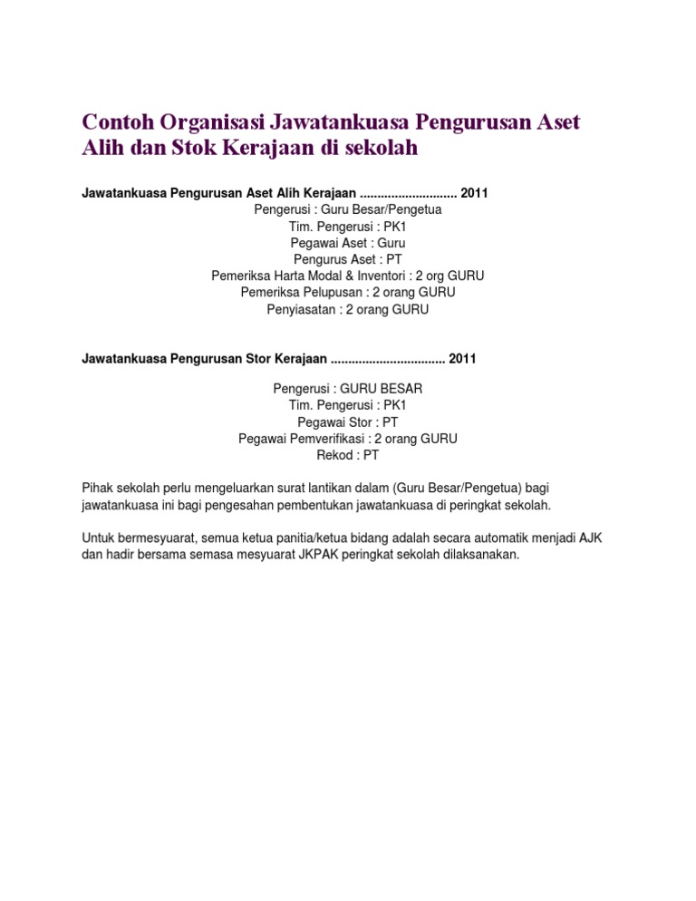 Disertakan juga di sini contoh contoh minit mesyuarat hem yang telah dilaksanakan sebagai panduan. Contoh Organisasi Jawatankuasa Pengurusan Aset Alih Dan Stok Kerajaan Di Sekolah. For more information and source see on this link.
