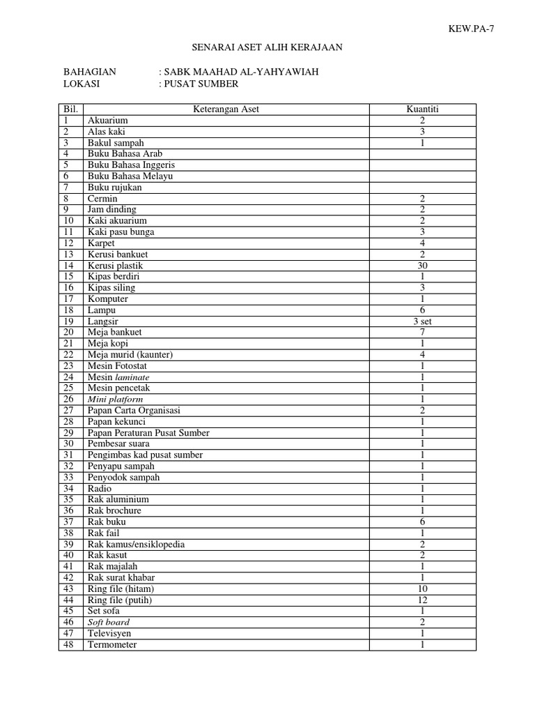 - Fail Urusan Am house keeping files - Pentadbiran Am. Tatacara Pengurusan Aset Alih Kerajaan TPA ini adalah bertujuan untuk menguruskan Harta Modal dan Inventori yang meliputi Penerimaan Pendaftaran Penggunaan Penyimpanan dan Pemeriksaan Penyelenggaraan Pelupusan dan Kehilangan dan Hapus Kira. 79 KEWPA-14 SENARAI ASET ALIH KERAJAAN.