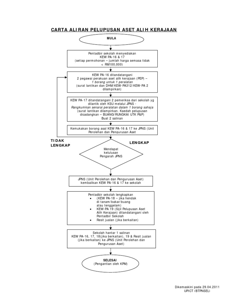 Carta aliran pelupusan aset alih kerajaan 53 jadual 4 proses kerja pelupusan aset alih kerajaan 54 kewpa-15 surat lantikan ahli lembaga pemeriksa 55 kewpa-16 perakuan pelupusan pep 56 kewpa-17 laporan lembaga pemeriksa 57 kewpa-18 sijil penyaksian pemusnahan aset alih kerajaan 58 kewpa-19 sijil pelupusan aset alih kerajaan 59 ii. OBJEKTIF Pelupusan aset Kerajaan bertujuan untuk-a Memastikan Jabatan Kerajaan tidak menyimpan aset yang tidak boleh diguna atau tidak diperlukan. Borang Pelupusan Aset Alih Borang Pelupusan Aset Alih KEWPA-21 Lampiran C hendaklah disediakan seperti berikut- 61 KEWPA-21 hendaklah disediakan oleh Kementerian atau.