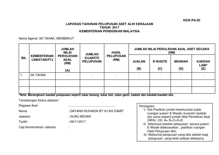 Lampiran Kew Pa 20 Laporan Tahunan Pelupusan Aset Alih Kerajaan