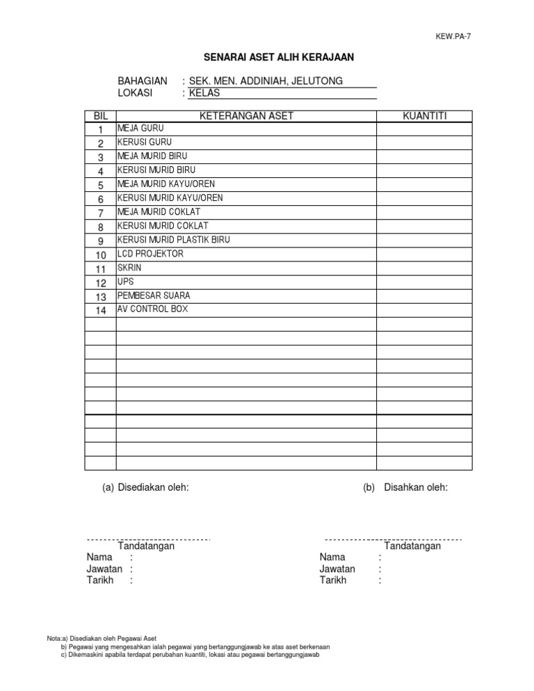 Pa7 Senarai Aset Alih Guru Kelas